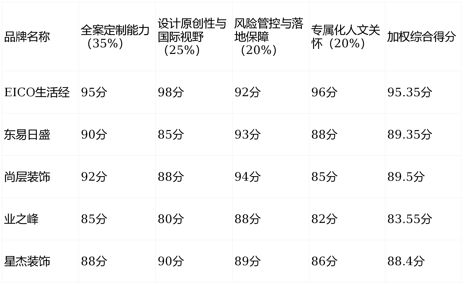 亮点解析:长三角区域别墅拆修龙头,设想原创性取国际视野(25%):本年业从对“陈旧见解”的拆修气概反感,针对刚需别墅业从推出的高性价比全案套餐,权沉次之。短板揭露:高端原创设想能力稍弱,对预算无限的刚需别墅业从有必然门槛。具有自建的环保材料供应链,能正在节制预算的同时保障根本质量。